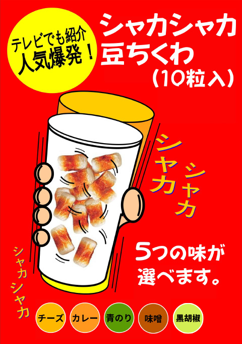 揚げた一口サイズの「豆ちくわ」をカップに入れて、お好みのフレーバーを加えてシャカシャカと振って作る「シャカシャカ豆ちくわ」もご好評をいただいております。フレーバーはチーズ・カレー・青のり・一味・黒胡椒の5種類。お好きな味付けをお選びいただけます。